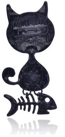 Broche esmaltado de gatito sonriendo con pez, color gris