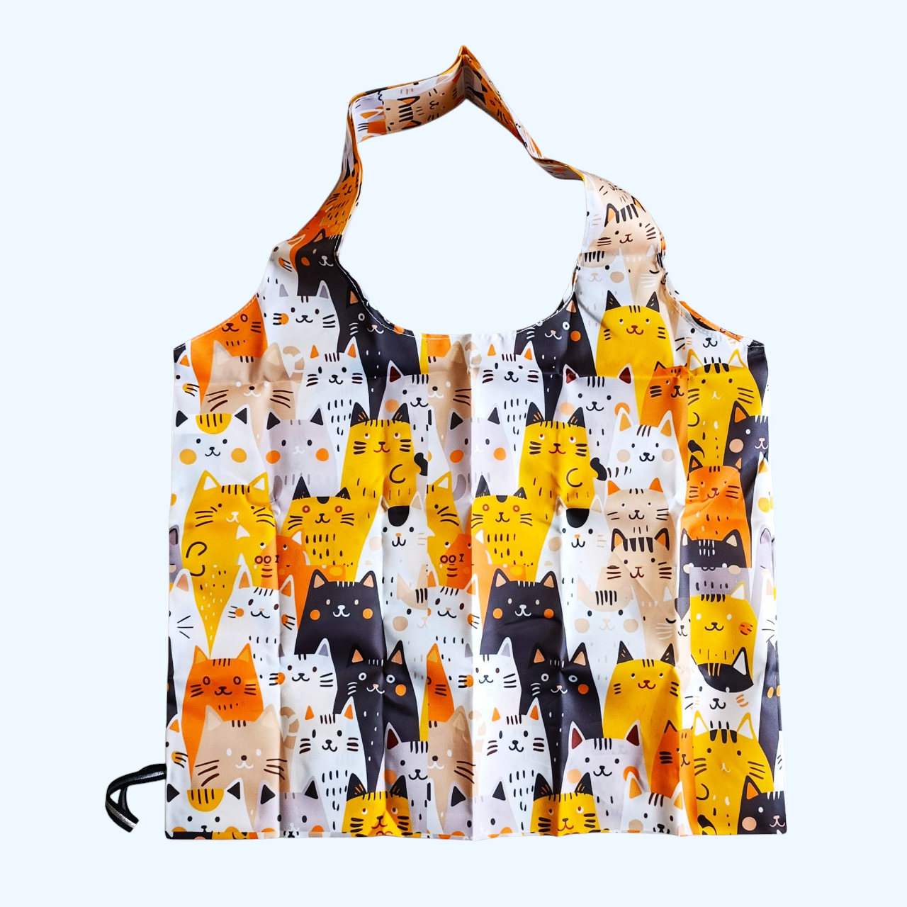 Haz tus compras con alegría y estilo gracias a esta bolsa reutilizable plegable con un estampado lleno de gatitos en tonos naranja, amarillo, blanco y negro. Su diseño divertido y colorido la convierte en el complemento perfecto para quienes aman a los gatos y quieren una alternativa práctica y ecológica.