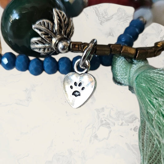 Pulsera triple elástica de cuentas de cristal y dijes de corazón con huella y "love my cat"