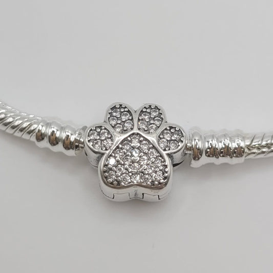 Pulsera de plata de ley tipo pandora con cierre en forma de huella con circonitas blancas