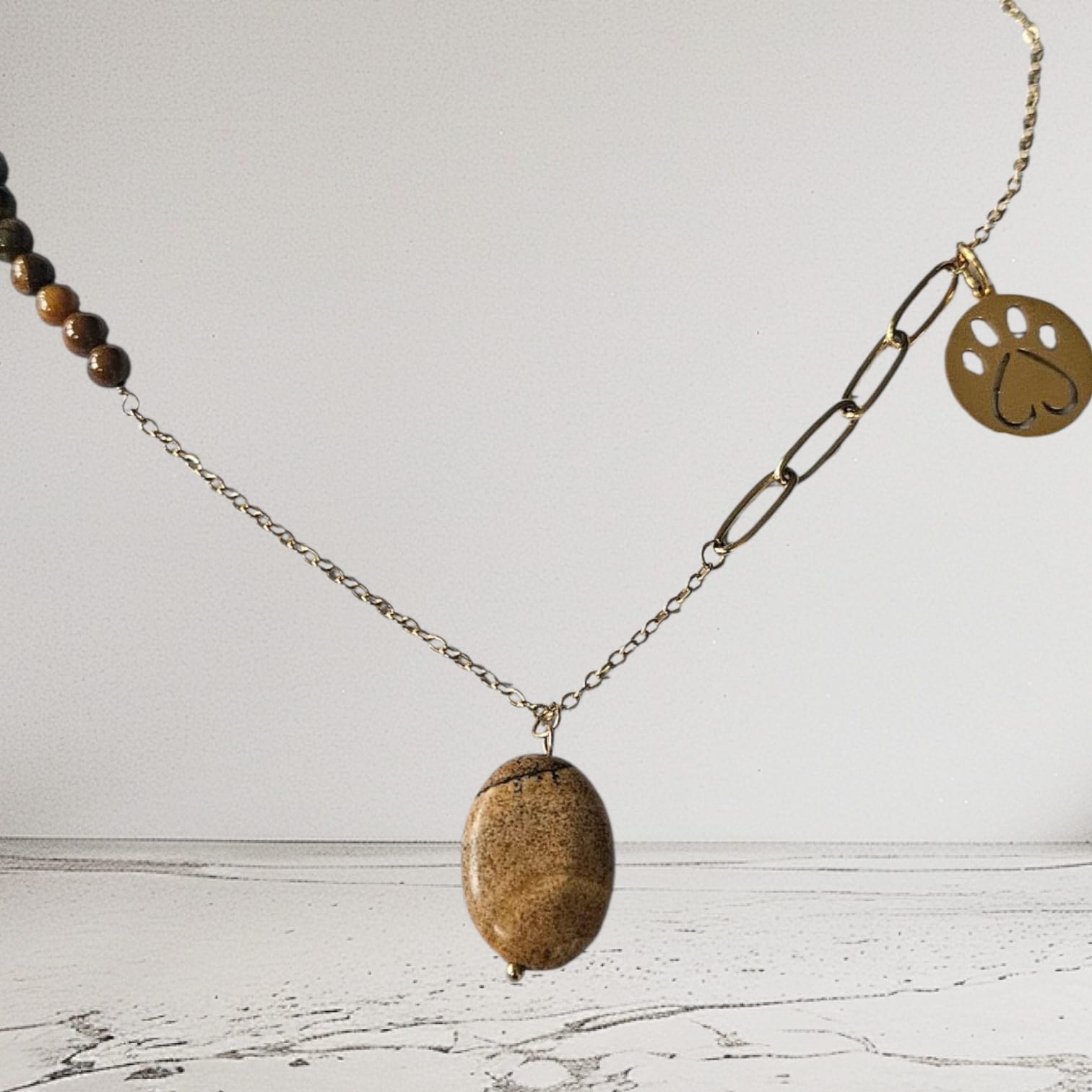 El collar Huella Tierra es una pieza elegante y con mucha personalidad, inspirada en los colores cálidos y en la conexión especial que tenemos con nuestros animales. Combina una piedra natural en tonos marrones, cuentas coordinadas y un charm de huella en acero inoxidable dorado que aporta un toque dulce y simbólico.